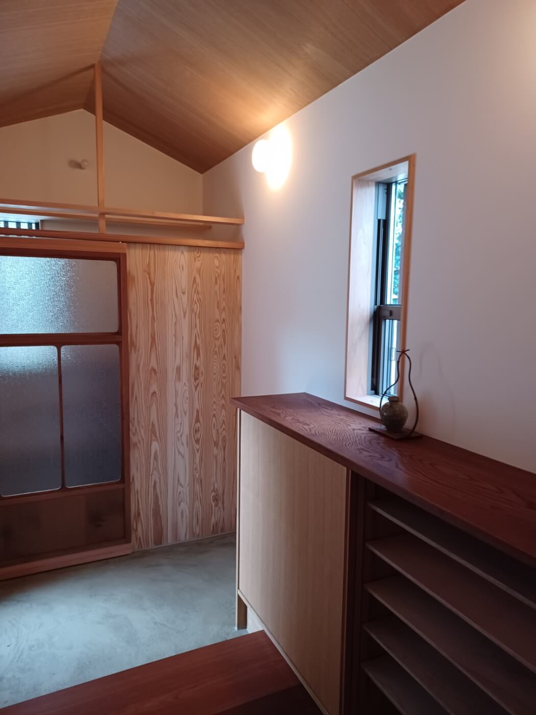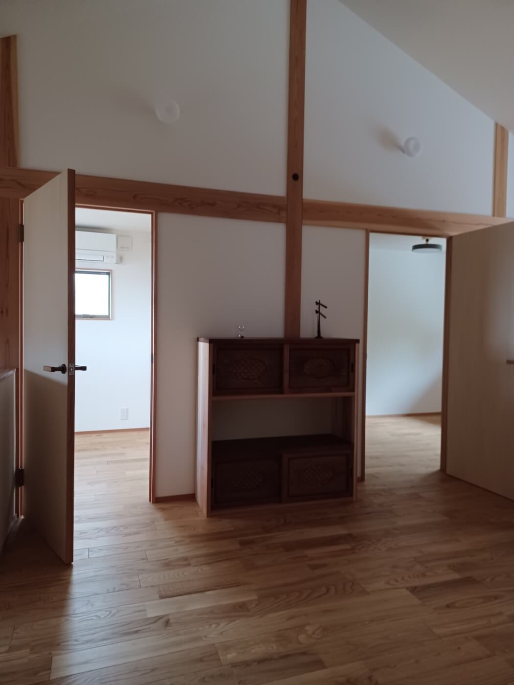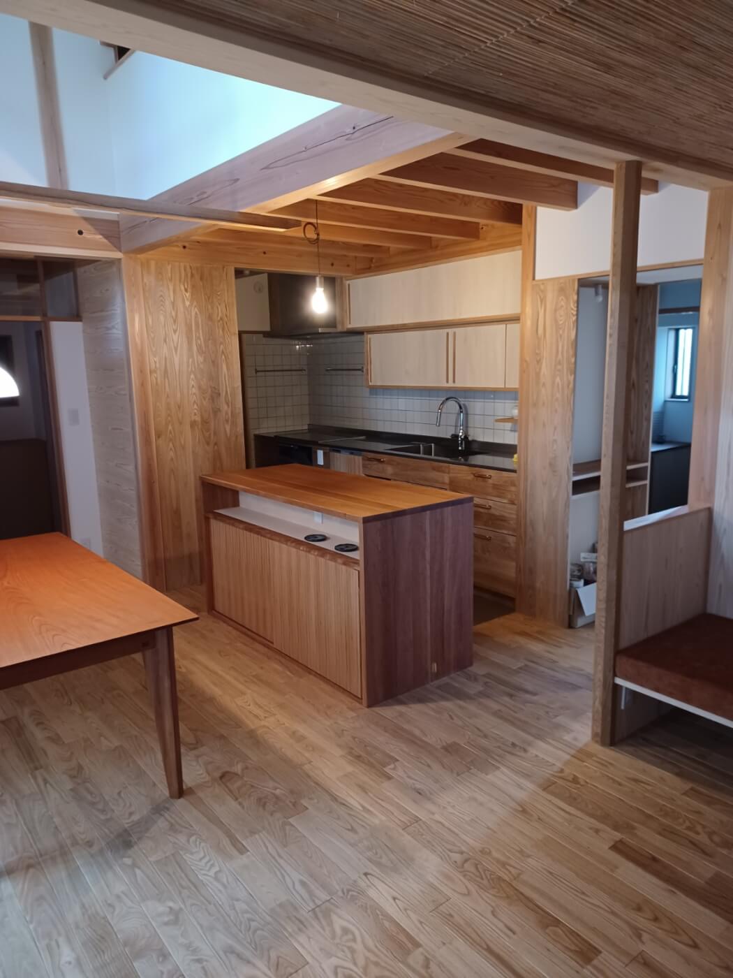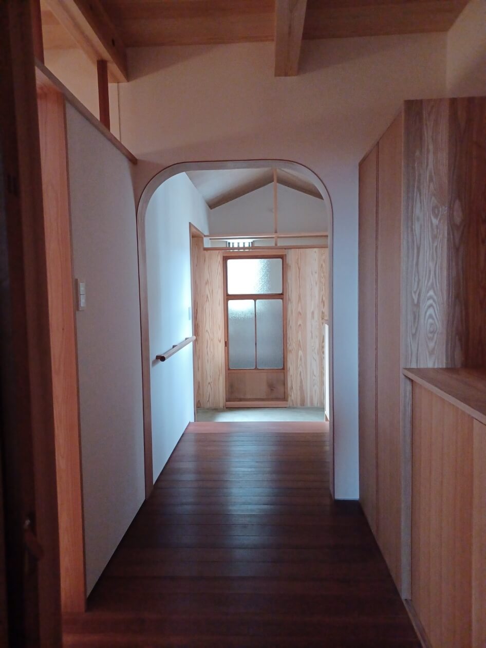 建物の意匠は、値打ちのある古材と杉の赤味やタモの新材を融合して使って、大工さんが手間暇かけてできた新築です。 外部からの木漏れ日や葉っぱの影が、空間の壁や障子に映る演出も素敵です。